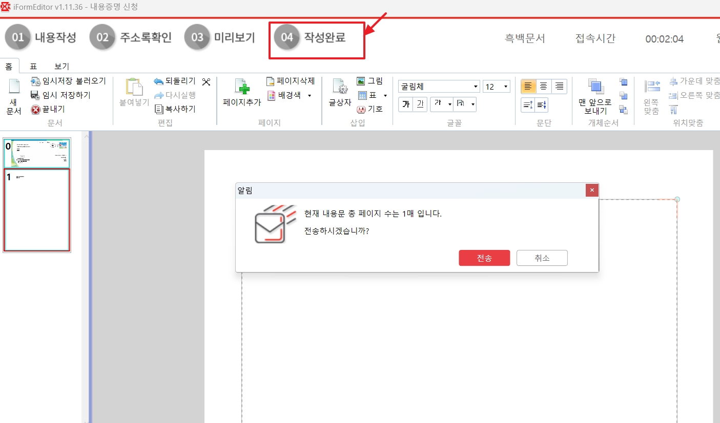 문서 첨부 후에 상단 메뉴의 순서대로 02. 주소록 확인 > 03. 미리보기 > 04. 작성완료 순서로 처리하자.