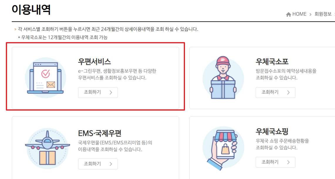 * 회원정보 > 이용내역 > 우편서비스 클릭 후 나의 내용증명 내역을 상세하게 확인 가능하다.